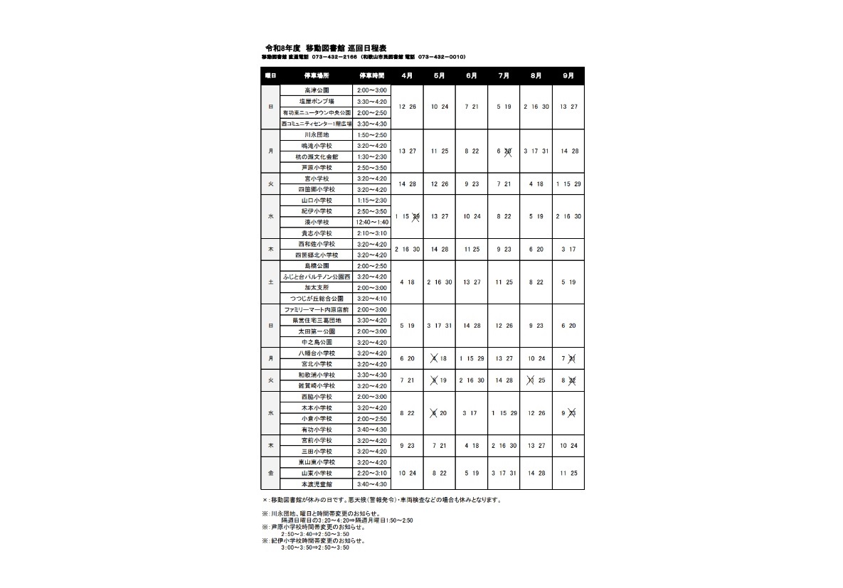 令和8年度4月から9月 移動図書館 巡回日程表