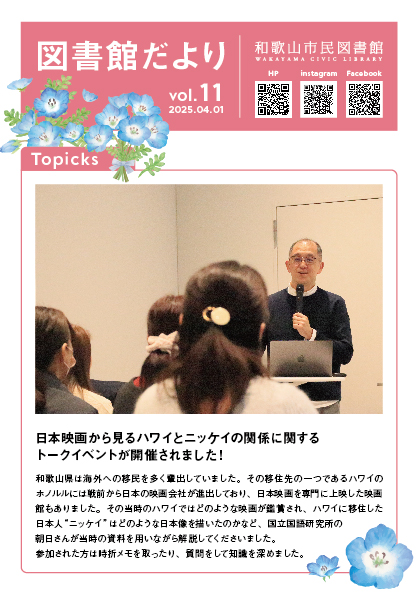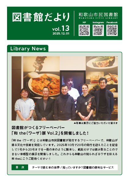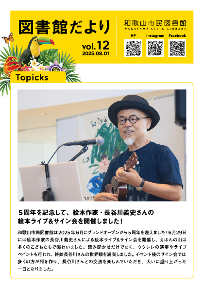 図書館だより 図書館のトピックスや本館・西分館で展開しているフェアの情報、図書館スタッフからのおすすめ本の紹介をしています。 最新号を公開しました。 図書館だよりVol.13 (2025年12月1日発行) libimg1764574352.pdf 図書館だより バックナンバー 図書館だよりVol.13 (2025年12月1日発行) [PDF形式: 2,447.9 KB] 図書館だよりVol.12 (2025年8月1日発行) [PDF形式: 2,447.9 KB] 図書館だよりVol.11 (2025年4月1日発行) [PDF形式: 6,397.1 KB] 図書館だよりVol.10 (2024年12月1日発行) [PDF形式: 3,989.3 KB] 図書館だよりVol.9 (2024年8月1日発行) [PDF形式: 1,685.8 KB] 図書館だよりVol.8 (2024年4月1日発行) [PDF形式: 2,613.9 KB] 図書館だよりVol.7 (2023年12月1日発行) [PDF形式: 2,388.7 KB] 図書館だより Vol.6 (2023年8月1日発行) [PDF形式: 1,542.5 KB] 図書館だよりVol.5 (2023年4月1日発行) [PDF形式: 590.9 KB] 図書館だよりVol.4 (2022年12月1日発行) [PDF形式: 1,357.6 KB] 図書館だよりVol.3 (2022年8月1日発行) [PDF形式: 1,328.1 KB] 図書館だよりVol.2 (2022年4月1日発行) [PDF形式: 2,501.2 KB] 図書館だよりVol.1 (2021年12月1日発行) [PDF形式: 1,267.0 KB]
